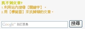 - 加入『站內搜尋』功能。站內搜尋應該要擺在明顯的位置,讓找不到文章的網友可以作搜尋。在台灣其實大部分的BSP(部落格服務平台)都有提供「站內搜尋」的服務,如果你是Google Blogger的使用者,則必須參加Adsense才能取得此項服務,但是你登記的年齡必須要大於20歲。不要問我為何是20歲,我也不知道。