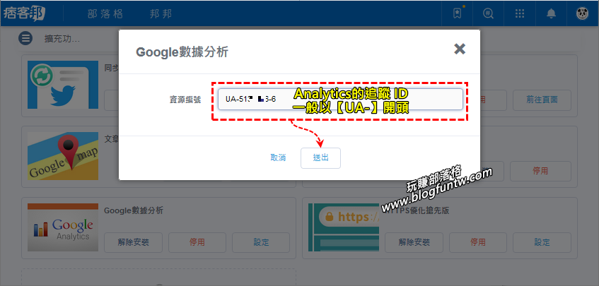 5.在「追蹤資源」的欄位輸入我們之前從GA那裡操來的ID編號,一般會是以【UA-】開頭的ID,然後按「送出」。
